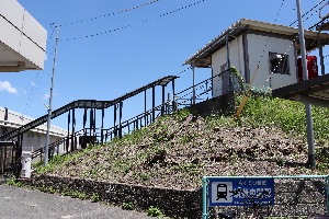 筑豊仲間電停は盛土上にあり、 階段を上ってホームに行く。 |
